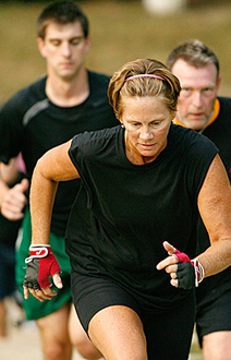 We're in constant motion for 60 minutes. We do exercises, hundreds of varieties so it never gets boring. Examples? Intervals, cross training, weight training, plyometrics, speed training, distance running, team building, and every kind of calisthenic, pushup, situp and pull up there is. We work every muscle from every angle.